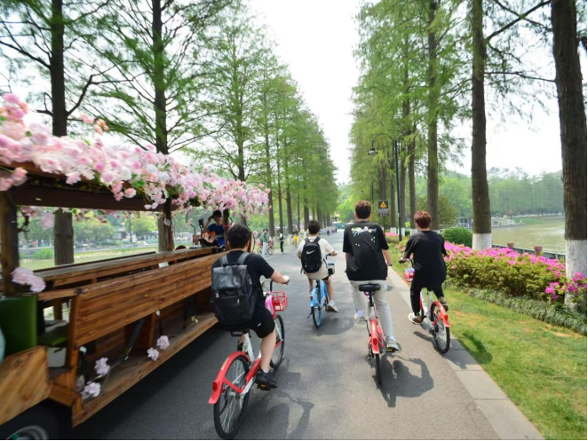 上午9时,志愿者们在东湖景区入口处集合完毕。骑行队伍分成六个小组有序出发。骑行路线全程约15公里,途经东湖听涛景区、磨山景区等主要景点。骑行过程中,同学们严格遵守交通规则,保持整齐队形,用实际行动诠释了绿色出行的文明风尚。活动负责人戴静文表示:“我们希望用骑行的方式,倡导更多人选择绿色出行,为减少碳排放贡献力量”。整齐的车队和醒目的宣传标语成为东湖畔一道亮丽的风景线。