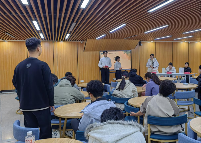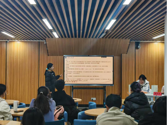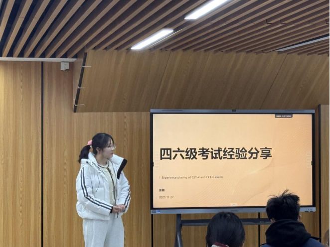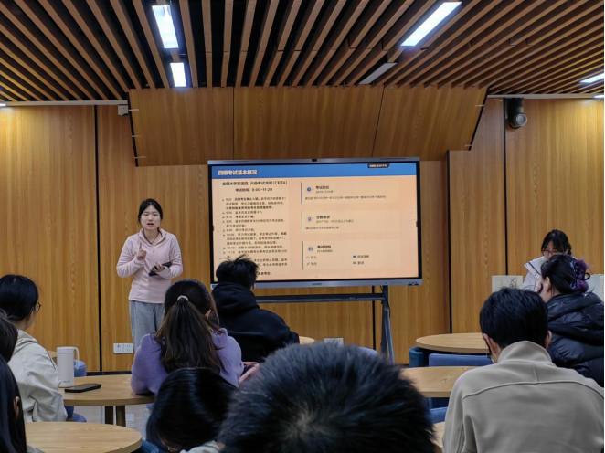 会上,张颖结合自身备考经历,重点分享了听力题型的答题技巧,她建议大家利用碎片时间反复精听真题,通过分析原文逻辑来提升捕捉关键信息的能力,同时要注意积累场景词汇和同义替换表达。胡申芳则聚焦阅读部分,强调“题干定位法”的重要性,她表示先圈画题干关键词再回原文找答案能大幅提高做题效率,还推荐大家整理错题时归类高频考点,针对性强化薄弱环节。吴瑜婷针对写作与翻译板块给出实用建议,她认为背诵优秀范文模板是基础,但更要学会灵活运用,平时多积累环保、科技等与专业相关的话题素材,确保写作内容充实且有亮点。