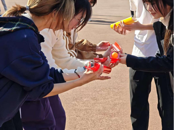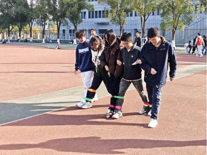 本次活动集六项趣味挑战于一体,同学们踊跃参与,现场热火朝天。活动开场“逢七必过”迅速破冰,数字接龙间笑声此起彼伏;“珠行万里”中队员手托PVC管道连成“信任通道”,乒乓球承载着全队目光在接力中滚滚向前;“一圈到底”里手拉手的圆圈因呼啦圈穿梭而动感十足,队员们以无声默契完成肢体与策略的双重考验;“五人六足”时“一二一”的口令响彻赛场,绑缚的脚踝让五人从磕绊到同频,肩并肩迈向终点;“聚力于绳”环节队员紧握长绳围成闭环,统一节奏中彰显集体力量;“班级拔河”最为扣人心弦,各班精英摩拳擦掌,哨声响起后呼声雷动,队员们咬牙后仰、齐心发力,用顽强斗志谱写团结赞歌。同学们在欢笑汗水中厚植友谊,凝聚班级力量,让青春活力在趣味竞技中绽放光彩。